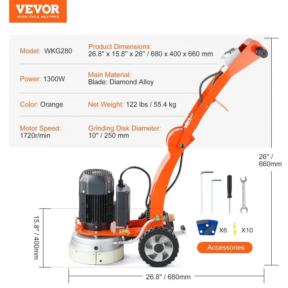 Electric Concrete Floor Grinder 10 Walk-Behind Grinder Concrete Floor Polisher 1300W Grinding Machine1720RPM Upgrade