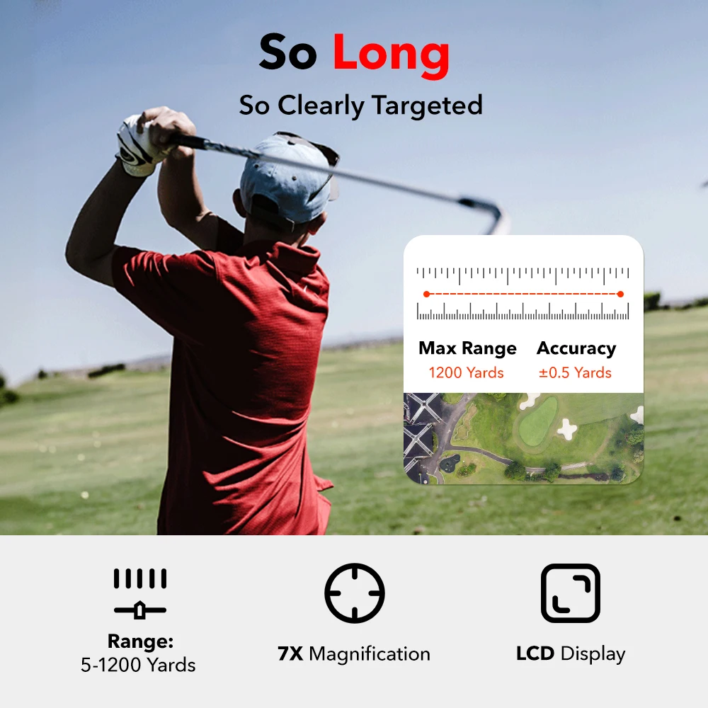 This golf rangefinder has a range of 5-1200 yards with an accuracy of 0.5 yards (yards/meters). It also has a transflective LCD display and a 7x magnification, which ensure clear and quick reading. The slope switch makes it legal for competition golf play while slope correction ensures even more precise distance.